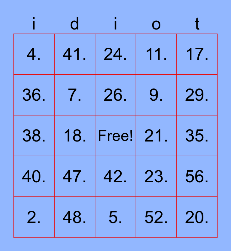 This bingo card has a free space and 57 words: 1., 2., 3., 4., 5., 6., 7., 8., 9., 10., 11., 12., 13., 14., 15., 16., 17., 18., 19., 20., 21., 22., 23., 24., 25., 26., 27., 28., 29., 30., 31., 32., 33., 34., 35., 36., 37., 38., 39., 40., 41., 42., 43., 44., 45., 46., 47., 48., 49., 50., 51., 52., 53., 54., 55., 56. and 57..