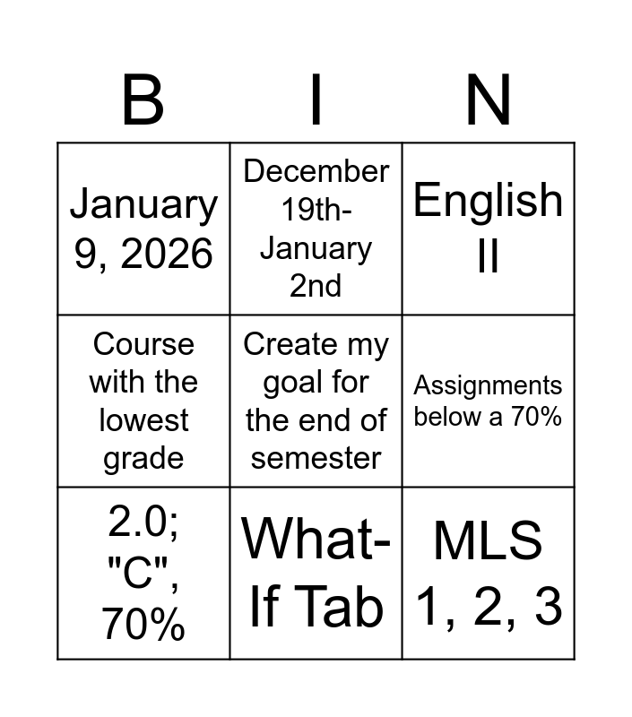 This bingo card has a free space and 8 words: Assignments below a 70%, English II, December 19th-January 2nd, 2.0; "C", 70%, January 9, 2026, MLS 1, 2, 3, Course with the lowest grade and What-If Tab.