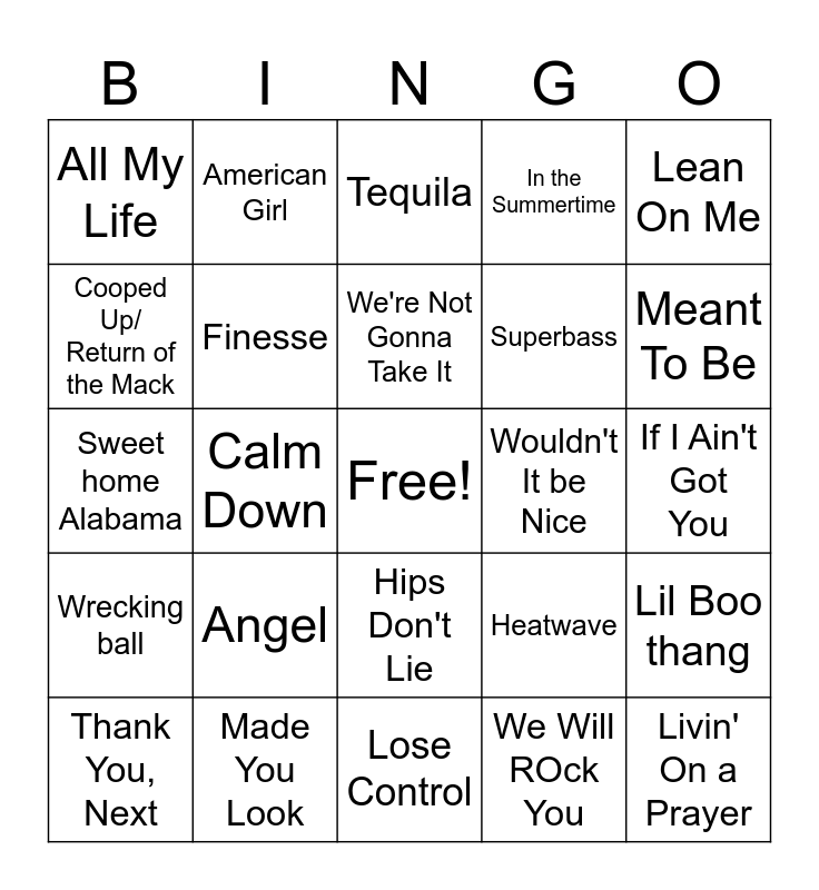 This bingo card has a free space and 24 words: Angel, Made You Look, We're Not Gonna Take It, Thank You, Next, Lean On Me, All My Life, Cooped Up/ Return of the Mack, American Girl, Wouldn't It be Nice, Hips Don't Lie, Superbass, Sweet home Alabama, Heatwave, Lil Boo thang, Finesse, We Will ROck You, If I Ain't Got You, Tequila, Meant To Be, Calm Down, Livin' On a Prayer, Wrecking ball, In the Summertime and Lose Control.
