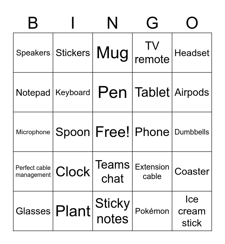 This bingo card has a free space and 24 words: Glasses, Clock, Pen, Pokémon, Headset, Speakers, Stickers, Mug, Phone, Dumbbells, Microphone, Keyboard, Extension cable, Coaster, Notepad, Plant, Sticky notes, TV remote, Airpods, Perfect cable management, Spoon, Teams chat, Tablet and Ice cream stick.