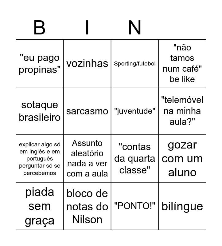 This bingo card has 23 words: bilíngue, reclamar/gozar de quem atrasou, "telemóvel na minha aula?", story time, sotaque brasileiro, "eu pago propinas", sarcasmo, vozinhas, piada sem graça, "Olá canárias", Assunto aleatório nada a ver com a aula, explicar algo só em inglês e em português perguntar só se percebemos, dar fokus num aluno, reclamar da Deisa, bloco de notas do Nilson, "tou a dar 3 cadeiras iguais ", Sporting/futebol, "contas da quarta classe", "juventude", gozar com um aluno, "não tamos num café" be like, "PONTO!" and Kostas.