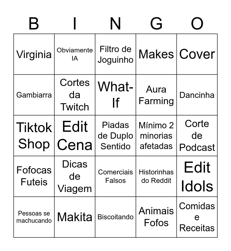 This bingo card has a free space and 24 words: Dicas de Viagem, Makita, What-If, Pessoas se machucando, Cover, Virginia, Gambiarra, Obviamente IA, Mínimo 2 minorias afetadas, Comerciais Falsos, Aura Farming, Tiktok Shop, Historinhas do Reddit, Edit Idols, Cortes da Twitch, Animais Fofos, Corte de Podcast, Filtro de Joguinho, Dancinha, Edit Cena, Comidas e Receitas, Fofocas Futeis, Makes and Biscoitando.