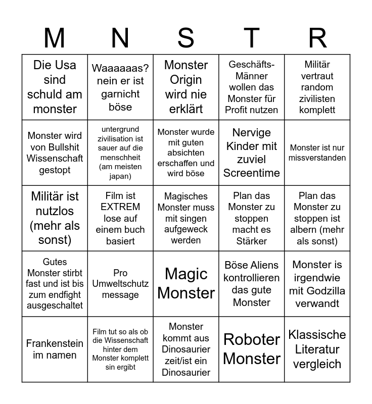 This bingo card has a free space and 24 words: Pro Umweltschutz message, Film tut so als ob die Wissenschaft hinter dem Monster komplett sin ergibt, Monster wurde mit guten absichten erschaffen und wird böse, Frankenstein im namen, Militär vertraut random zivilisten komplett, Die Usa sind schuld am monster, Monster wird von Bullshit Wissenschaft gestopt, Waaaaaas? nein er ist garnicht böse, Plan das Monster zu stoppen macht es Stärker, Magic Monster, Nervige Kinder mit zuviel Screentime, Militär ist nutzlos (mehr als sonst), Böse Aliens kontrollieren das gute Monster, Monster is irgendwie mit Godzilla verwandt, untergrund zivilisation ist sauer auf die menschheit (am meisten japan), Roboter Monster, Plan das Monster zu stoppen ist albern (mehr als sonst), Monster Origin wird nie erklärt, Monster ist nur missverstanden, Film ist EXTREM lose auf einem buch basiert, Klassische Literatur vergleich, Gutes Monster stirbt fast und ist bis zum endfight ausgeschaltet, Geschäfts- Männer wollen das Monster für Profit nutzen and Monster kommt aus Dinosaurier zeit/ist ein Dinosaurier.