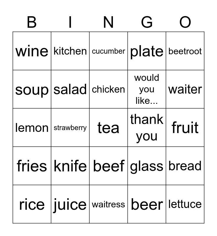 This bingo card has 25 words: knife, waitress, chicken, rice, beetroot, wine, soup, kitchen, thank you, beef, would you like..., lemon, glass, bread, salad, lettuce, fruit, cucumber, waiter, strawberry, tea, juice, fries, plate and beer.
