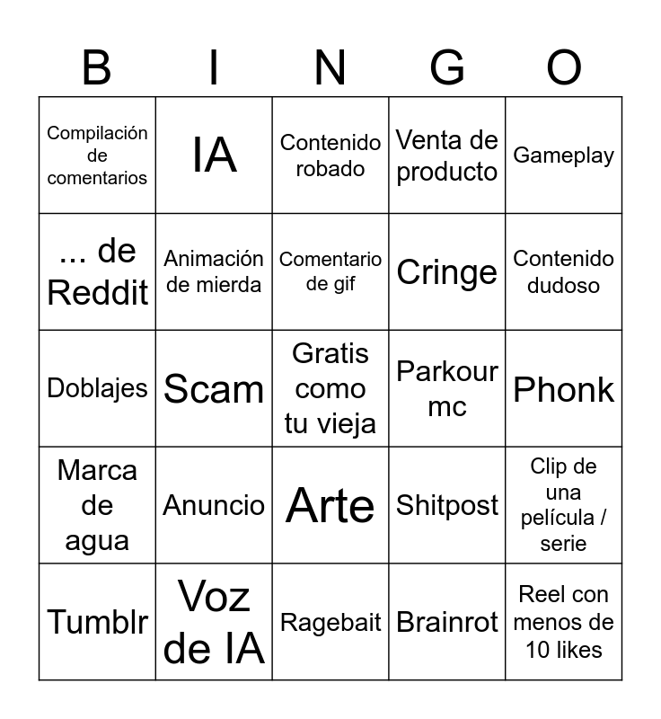 This bingo card has a free space and 24 words: Anuncio, Voz de IA, Comentario de gif, Tumblr, Gameplay, Compilación de comentarios, ... de Reddit, IA, Parkour mc, Arte, Cringe, Doblajes, Shitpost, Clip de una película / serie, Animación de mierda, Brainrot, Phonk, Contenido robado, Contenido dudoso, Scam, Reel con menos de 10 likes, Marca de agua, Venta de producto and Ragebait.
