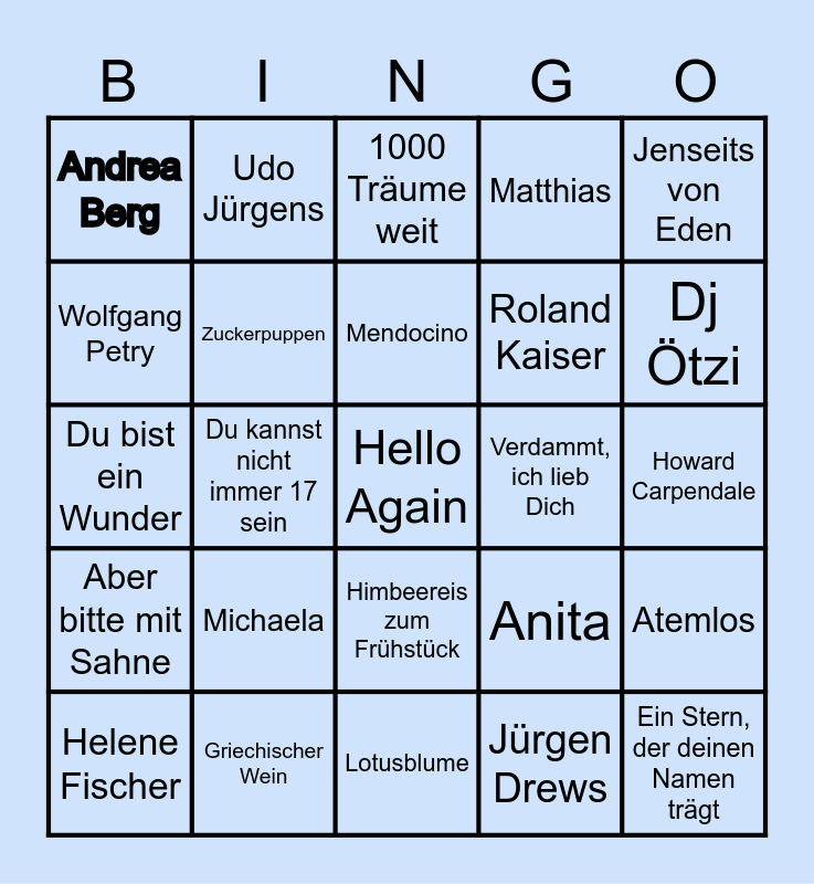 This bingo card has a free space and 24 words: Michaela, Griechischer Wein, Mendocino, Helene Fischer, Jenseits von Eden, Andrea Berg, Wolfgang Petry, Udo Jürgens, Verdammt, ich lieb Dich, Himbeereis zum Frühstück, Roland Kaiser, Du bist ein Wunder, Anita, Atemlos, Zuckerpuppen, Jürgen Drews, Howard Carpendale, 1000 Träume weit, Dj Ötzi, Du kannst nicht immer 17 sein, Ein Stern, der deinen Namen trägt, Aber bitte mit Sahne, Matthias and Lotusblume.