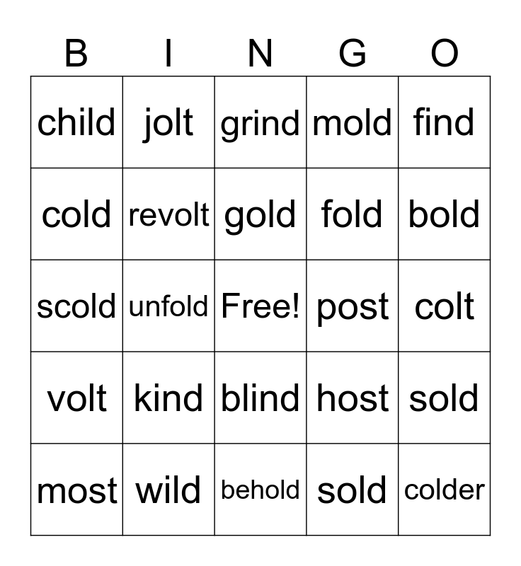 This bingo card has a free space and 24 words: kind, wild, gold, most, find, child, cold, jolt, post, blind, fold, scold, host, sold, revolt, sold, colt, grind, bold, unfold, colder, volt, mold and behold.