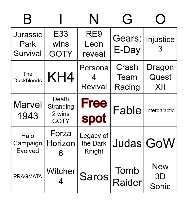 This bingo card has a free space and 24 words: Forza Horizon 6, Witcher 4, Persona 4 Revival, PRAGMATA, Injustice 3, Jurassic Park Survival, The Duskbloods, E33 wins GOTY, Fable, Legacy of the Dark Knight, Crash Team Racing, Marvel 1943, Judas, GoW, KH4, Tomb Raider, Intergalactic, RE9 Leon reveal, Dragon Quest XII, Death Stranding 2 wins GOTY, New 3D Sonic, Halo Campaign Evolved, Gears: E-Day and Saros.