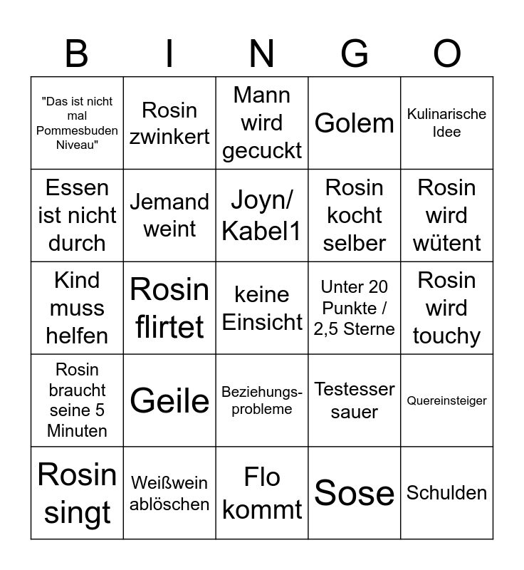 This bingo card has 25 words: Geile, Flo kommt, Joyn/ Kabel1, Rosin singt, Kulinarische Idee, "Das ist nicht mal Pommesbuden Niveau", Essen ist nicht durch, Rosin zwinkert, Unter 20 Punkte / 2,5 Sterne, Beziehungs- probleme, Rosin kocht selber, Kind muss helfen, Testesser sauer, Quereinsteiger, Jemand weint, Schulden, Rosin wird touchy, Mann wird gecuckt, Rosin wird wütent, Rosin flirtet, keine Einsicht, Weißwein ablöschen, Rosin braucht seine 5 Minuten, Golem and Sose.