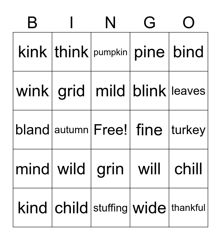 This bingo card has a free space and 24 words: wild, child, mild, kind, bind, kink, wink, think, fine, grin, blink, bland, will, chill, grid, wide, turkey, pumpkin, leaves, autumn, thankful, mind, pine and stuffing.