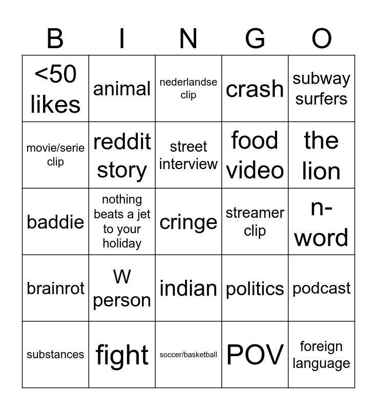 This bingo card has a free space and 24 words: W person, fight, street interview, substances, subway surfers, <50 likes, movie/serie clip, animal, streamer clip, indian, food video, baddie, politics, podcast, reddit story, POV, n-word, nederlandse clip, the lion, nothing beats a jet to your holiday, foreign language, brainrot, crash and soccer/basketball.