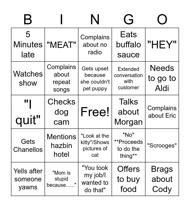 This bingo card has a free space and 29 words: Yells after someone yawns, "PUPPY?!?!", Checks dog cam, Drinks hot chocolate, 5 Minutes late, Complains about no radio, Complains about repeat songs, Mentions hazbin hotel, Talks about Morgan, "Mom is stupid because......", Complains about Eric, Brags about Cody, "You took my job/I wanted to do that", Offers to buy food, Needs to go to Aldi, "It's all your fault", "Look at the kitty"/Shows pictures of cat, Gets Chanellos, "HEY", "I quit", "No" **Proceeds to do the thing**, Complains about it being cold, Extended conversation with customer, Watches show, Eats buffalo sauce, "MEAT", "Scrooges", Gets upset because she couldn't pet puppy and "UUGGHHH".