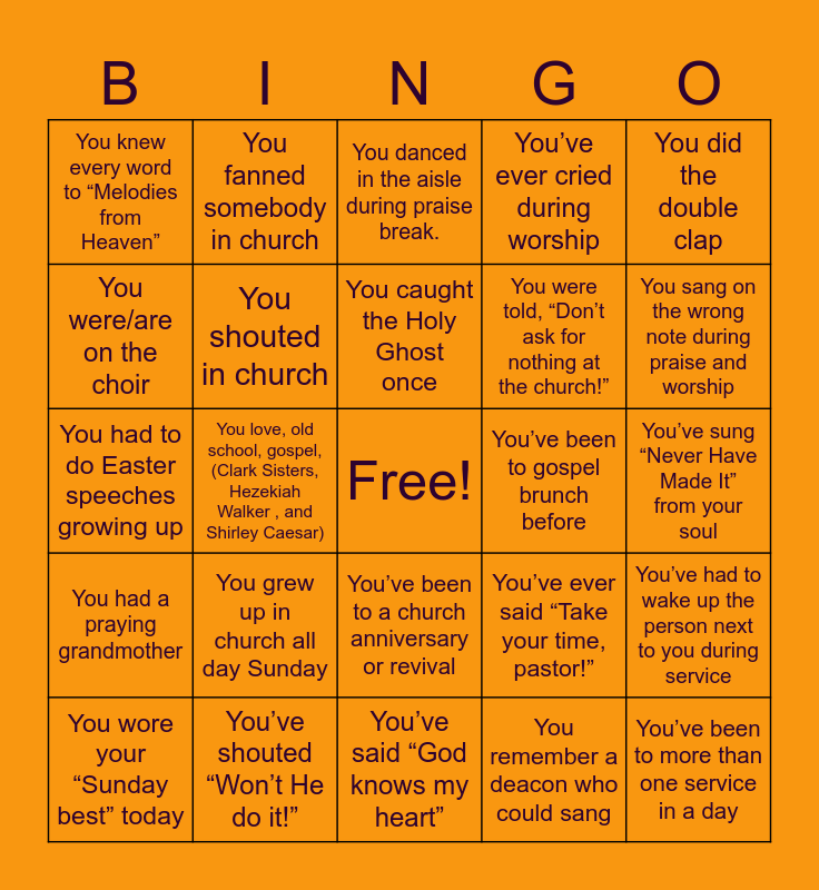 This bingo card has a free space and 24 words: You grew up in church all day Sunday, You’ve shouted “Won’t He do it!”, You caught the Holy Ghost once, You wore your “Sunday best” today, You did the double clap, You knew every word to “Melodies from Heaven”, You were/are on the choir, You fanned somebody in church, You’ve been to gospel brunch before, You’ve been to a church anniversary or revival, You were told, “Don’t ask for nothing at the church!”, You had to do Easter speeches growing up, You’ve ever said “Take your time, pastor!”, You’ve had to wake up the person next to you during service, You shouted in church, You remember a deacon who could sang, You’ve sung “Never Have Made It” from your soul, You danced in the aisle during praise break., You sang on the wrong note during praise and worship, You love, old school, gospel, (Clark Sisters, Hezekiah Walker , and Shirley Caesar), You’ve been to more than one service in a day, You had a praying grandmother, You’ve ever cried during worship and You’ve said “God knows my heart”.