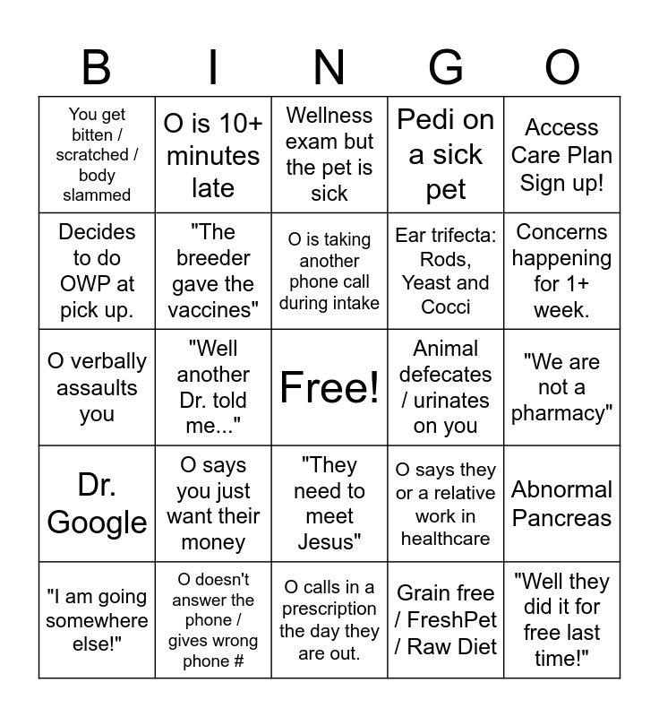 This bingo card has a free space and 24 words: O says you just want their money, O doesn't answer the phone / gives wrong phone #, O is taking another phone call during intake, "I am going somewhere else!", Access Care Plan Sign up!, You get bitten / scratched / body slammed, Decides to do OWP at pick up., O is 10+ minutes late, Animal defecates / urinates on you, "They need to meet Jesus", Ear trifecta: Rods, Yeast and Cocci, O verbally assaults you, O says they or a relative work in healthcare, Abnormal Pancreas, "The breeder gave the vaccines", Grain free / FreshPet / Raw Diet, "We are not a pharmacy", Wellness exam but the pet is sick, Concerns happening for 1+ week., "Well another Dr. told me...", "Well they did it for free last time!", Dr. Google, Pedi on a sick pet and O calls in a prescription the day they are out..