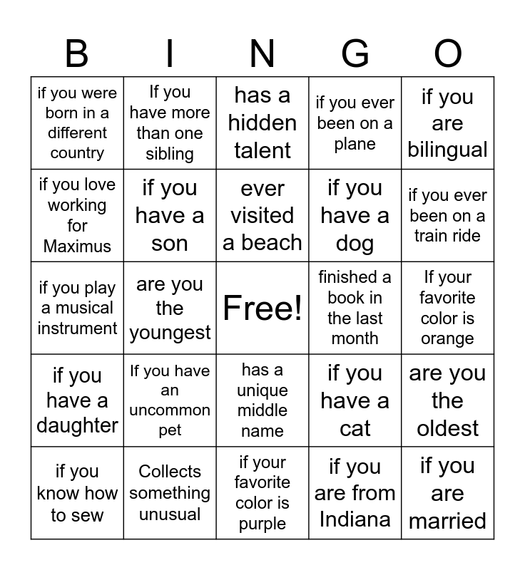 This bingo card has a free space and 24 words: If you have an uncommon pet, Collects something unusual, ever visited a beach, if you know how to sew, if you are bilingual, if you were born in a different country, if you love working for Maximus, If you have more than one sibling, finished a book in the last month, has a unique middle name, if you have a dog, if you play a musical instrument, if you have a cat, are you the oldest, if you have a son, if you are from Indiana, If your favorite color is orange, has a hidden talent, if you ever been on a train ride, are you the youngest, if you are married, if you have a daughter, if you ever been on a plane and if your favorite color is purple.