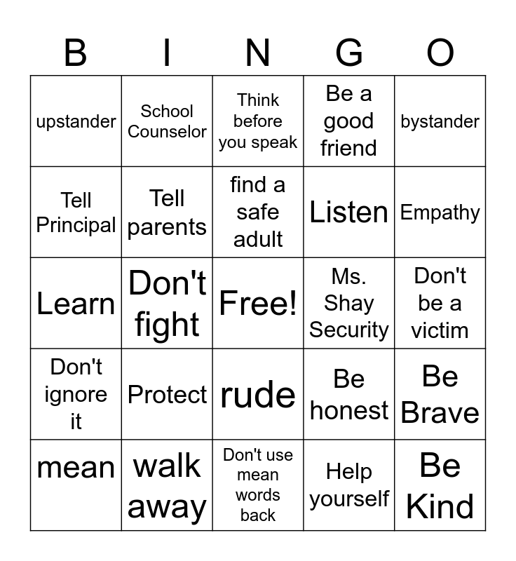 This bingo card has a free space and 24 words: Protect, walk away, find a safe adult, mean, bystander, upstander, Tell Principal, School Counselor, Ms. Shay Security, rude, Listen, Learn, Be honest, Be Brave, Tell parents, Help yourself, Don't be a victim, Think before you speak, Empathy, Don't fight, Be Kind, Don't ignore it, Be a good friend and Don't use mean words back.