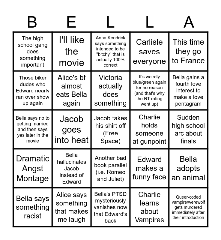This bingo card has a free space and 24 words: Bella hallucinates Jacob instead of Edward, Alice says something that makes me laugh, Victoria actually does something, Bella says something racist, This time they go to France, The high school gang does something important, Those biker dudes who Edward nearly ran over show up again, I'll like the movie, Charlie holds someone at gunpoint, Another bad book parallel (i.e. Romeo and Juliet), It's weirdly blue/green again for no reason (and that's why the RT rating went up), Bella says no to getting married and then says yes later in the movie, Edward makes a funny face, Bella adopts an animal, Alice's bf almost eats Bella again, Charlie learns about Vampires, Sudden high school arc about finals, Anna Kendrick says something intended to be "bitchy" that is actually 100% correct, Bella gains a fourth love interest to make a love pentagram, Jacob goes into heat, Queer-coded vampire/werewolf gets murdered immediately after their introduction, Dramatic Angst Montage, Carlisle saves everyone and Bella's PTSD mysteriously vanishes now that Edward's back.