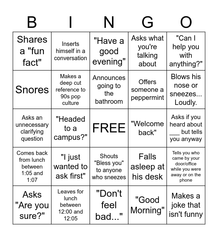 This bingo card has a free space and 24 words: "I just wanted to ask first", Leaves for lunch between 12:00 and 12:05, Announces going to the bathroom, Asks "Are you sure?", "Can I help you with anything?", Shares a "fun fact", Snores, Inserts himself in a conversation, "Welcome back", Shouts "Bless you" to anyone who sneezes, Offers someone a peppermint, Asks an unnecessary clarifying question, Falls asleep at his desk, Tells you who came by your door/office while you were away or on the phone, Makes a deep cut reference to 90s pop culture, "Good Morning", Asks if you heard about ___ but tells you anyway, "Have a good evening", Blows his nose or sneezes... Loudly., "Headed to a campus?", Makes a joke that isn't funny, Comes back from lunch between 1:05 and 1:07, Asks what you're talking about and "Don't feel bad...".