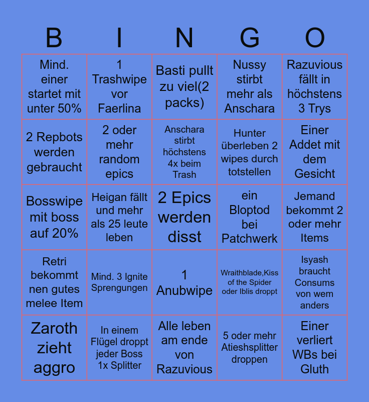This bingo card has a free space and 24 words: Mind. 3 Ignite Sprengungen, In einem Flügel droppt jeder Boss 1x Splitter, Anschara stirbt höchstens 4x beim Trash, Zaroth zieht aggro, Razuvious fällt in höchstens 3 Trys, Mind. einer startet mit unter 50%, 2 Repbots werden gebraucht, 1 Trashwipe vor Faerlina, ein Bloptod bei Patchwerk, 1 Anubwipe, Hunter überleben 2 wipes durch totstellen, Bosswipe mit boss auf 20%, Wraithblade,Kiss of the Spider oder Iblis droppt, Isyash braucht Consums von wem anders, 2 oder mehr random epics, 5 oder mehr Atieshsplitter droppen, Jemand bekommt 2 oder mehr Items, Basti pullt zu viel(2 packs), Einer Addet mit dem Gesicht, Heigan fällt und mehr als 25 leute leben, Einer verliert WBs bei Gluth, Retri bekommt nen gutes melee Item, Nussy stirbt mehr als Anschara and Alle leben am ende von Razuvious.