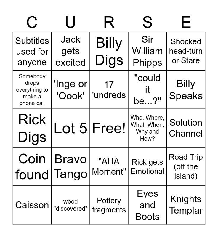 This bingo card has a free space and 26 words: "AHA Moment", Eyes and Boots, 17 'undreds, wood "discovered", Shocked head-turn or Stare, Subtitles used for anyone, Somebody drops everything to make a phone call, Jack gets excited, Solution Channel, Rick gets Emotional, "could it be...?", Rick Digs, Road Trip (off the island), Caisson, Lot 5, XRF or CT-scan, Sir William Phipps, Coin found, Billy Digs, Knights Templar, Billy Speaks, Pottery fragments, Who, Where, What, When, Why and How?, Bravo Tango, 'Inge or 'Oook' and "Wow".