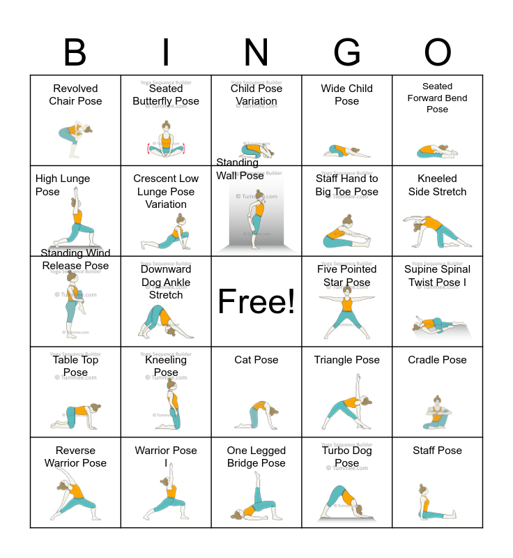 This bingo card has 54 images, a free space and 54 words: Upward Forward Fold Pose, Table Top Pose, Warrior II Pose, Cow Pose, Cat Pose, Plank Pose, Wide Child Pose, Easy Pose, High Lunge Pose, Chair Pose, Revolved Chair Pose, Low Lunge Pose, Warrior Pose I, Reverse Warrior Pose, Bridge Pose, One Legged Bridge Pose, Staff Pose, Staff Hand to Big Toe Pose, Supine Spinal Twist Pose II, Supine Spinal Twist Pose I, Triangle Pose, Garland Pose, Five Pointed Star Pose, Seated Forward Bend Pose, Bound Angle Pose, Seated Butterfly Pose, Bound Angle Forward Bend Pose, Tree Pose, Puppy Dog Pose, Turbo Dog Pose, Goddess Pose, Locust Pose, Downward Dog Pose, Child Pose, Child Pose Variation, Wind Release Pose, Standing Wind Release Pose, Cradle Pose, Standing Cradle Pose, Crescent Low Lunge Pose Variation, Bridge Pose Variation Ankles, Revolved Triangle Pose, Intense Leg Stretch C, Intense Leg Stretch D, Kneeling Pose, Pigeon Pose, Half Pigeon Pose, Standing Pigeon Pose, Standing Wall Pose, Downward Dog Ankle Stretch, Kneeled Side Stretch, Kneeling Side Bend Pose, Wrist Extension Stretch and Sitting Wrist Stretch.