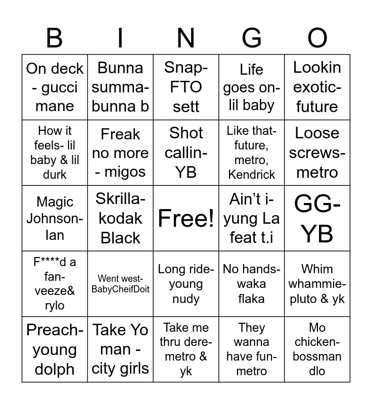 This bingo card has a free space and 29 words: Preach- young dolph, Faneto- chief keef, Skrilla- kodak Black, Vette motors- YB, On deck - gucci mane, Snap- FTO sett, Freak no more - migos, Went west- BabyCheifDoit, Ain’t i- yung La feat t.i, Take Yo man - city girls, GG- YB, Mo chicken- bossman dlo, Take me thru dere- metro & yk, They wanna have fun- metro, Loose screws- metro, Motion picture- future, Long ride- young nudy, F****d a fan- veeze& rylo, Lookin exotic- future, Magic Johnson- Ian, No hands- waka flaka, This could be us- Rae sremmurd, Like that- future, metro, Kendrick, How it feels- lil baby & lil durk, Life goes on- lil baby, Bunna summa- bunna b, Whim whammie- pluto & yk, Shot callin- YB and What you is- YB.