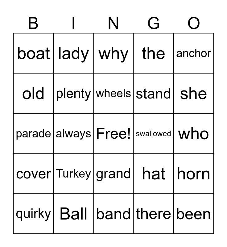 This bingo card has a free space and 24 words: Turkey, Ball, wheels, quirky, anchor, boat, old, lady, swallowed, grand, stand, parade, hat, horn, plenty, there, who, why, she, always, been, cover, the and band.