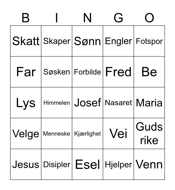 This bingo card has 29 words: Jesus, Gud, Himmelen, Venn, Skatt, Sønn, Søsken, Menneske, Nasaret, Disipler, Maria, Josef, Esel, Hjelper, Be, Tro, Kjærlighet, Velge, Fotspor, Lys, Vei, Kraft, Fred, Far, Engler, Skaper, Guds rike, Forbilde and Bibelen.