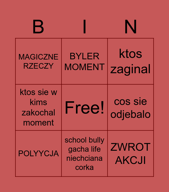 This bingo card has a free space and 8 words: cos sie odjebalo, ktos zaginal, BYLER MOMENT, POLYYCJA, MAGICZNE RZECZY, ZWROT AKCJI, ktos sie w kims zakochal moment and school bully gacha life niechciana corka.