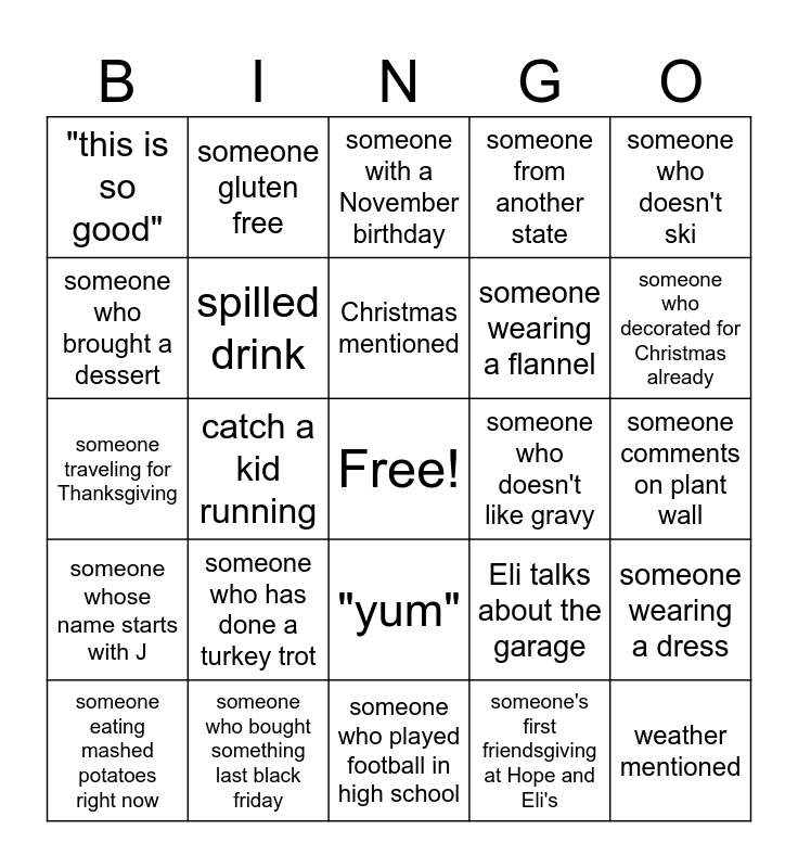 This bingo card has a free space and 28 words: someone wearing a dress, someone wearing fuzzy socks, someone wearing a flannel, someone's first friendsgiving at Hope and Eli's, someone who brought a dessert, someone with a November birthday, someone gluten free, someone whose name starts with J, someone who doesn't like gravy, someone eating mashed potatoes right now, someone traveling for Thanksgiving, someone from another state, someone who bought something last black friday, someone who played football in high school, someone who decorated for Christmas already, someone who will be skiing on Thanksgiving, someone who has done a turkey trot, spilled drink, Christmas mentioned, "yum", "this is so good", "Go Cats", weather mentioned, catch a kid running, someone comments on plant wall, Eli talks about the garage, someone who doesn't ski and someone with a pet cat.