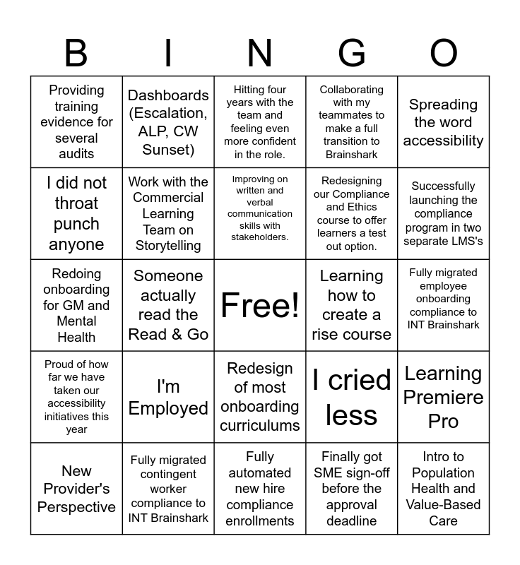 This bingo card has a free space and 24 words: I'm Employed, Fully migrated contingent worker compliance to INT Brainshark, Improving on written and verbal communication skills with stakeholders., New Provider's Perspective, Spreading the word accessibility, Providing training evidence for several audits, I did not throat punch anyone, Dashboards (Escalation, ALP, CW Sunset), Learning how to create a rise course, Redesign of most onboarding curriculums, Redesigning our Compliance and Ethics course to offer learners a test out option., Redoing onboarding for GM and Mental Health, I cried less, Learning Premiere Pro, Work with the Commercial Learning Team on Storytelling, Finally got SME sign-off before the approval deadline, Fully migrated employee onboarding compliance to INT Brainshark, Hitting four years with the team and feeling even more confident in the role., Successfully launching the compliance program in two separate LMS's, Someone actually read the Read & Go, Intro to Population Health and Value-Based Care, Proud of how far we have taken our accessibility initiatives this year, Collaborating with my teammates to make a full transition to Brainshark and Fully automated new hire compliance enrollments.