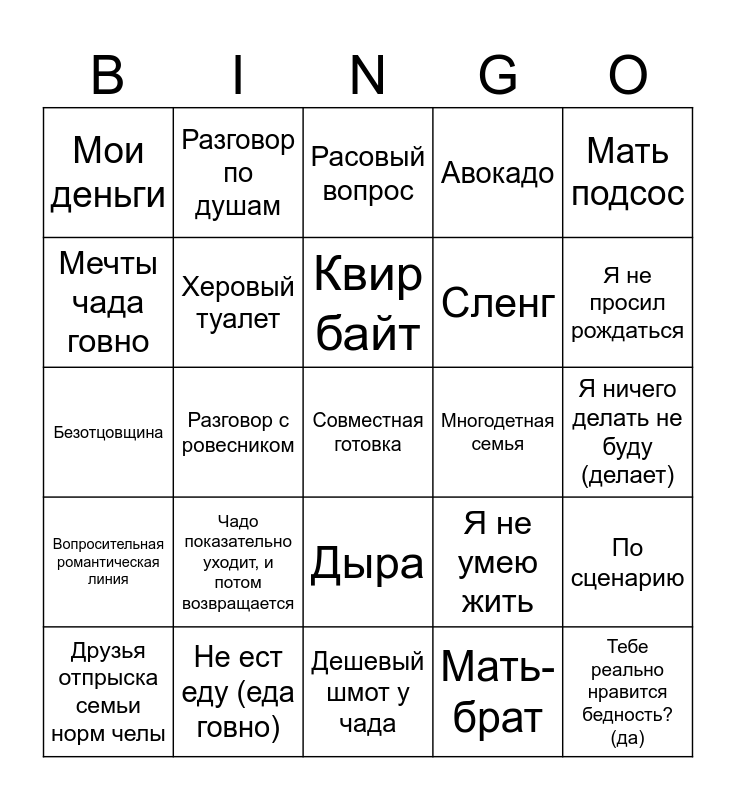 This bingo card has a free space and 24 words: Чадо показательно уходит, и потом возвращается, Не ест еду (еда говно), Квир байт, Друзья отпрыска семьи норм челы, Мать подсос, Мои деньги, Мечты чада говно, Разговор по душам, Многодетная семья, Дыра, Сленг, Безотцовщина, Я не умею жить, По сценарию, Херовый туалет, Мать-брат, Я ничего делать не буду (делает), Расовый вопрос, Я не просил рождаться, Разговор с ровесником, Тебе реально нравится бедность? (да), Вопросительная романтическая линия, Авокадо and Дешевый шмот у чада.