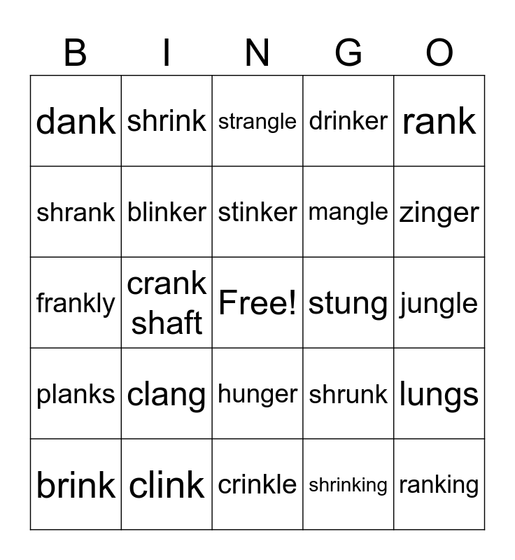 This bingo card has a free space and 24 words: clang, clink, stinker, brink, rank, dank, shrank, shrink, stung, hunger, mangle, frankly, shrunk, lungs, blinker, shrinking, jungle, strangle, zinger, crank shaft, ranking, planks, drinker and crinkle.