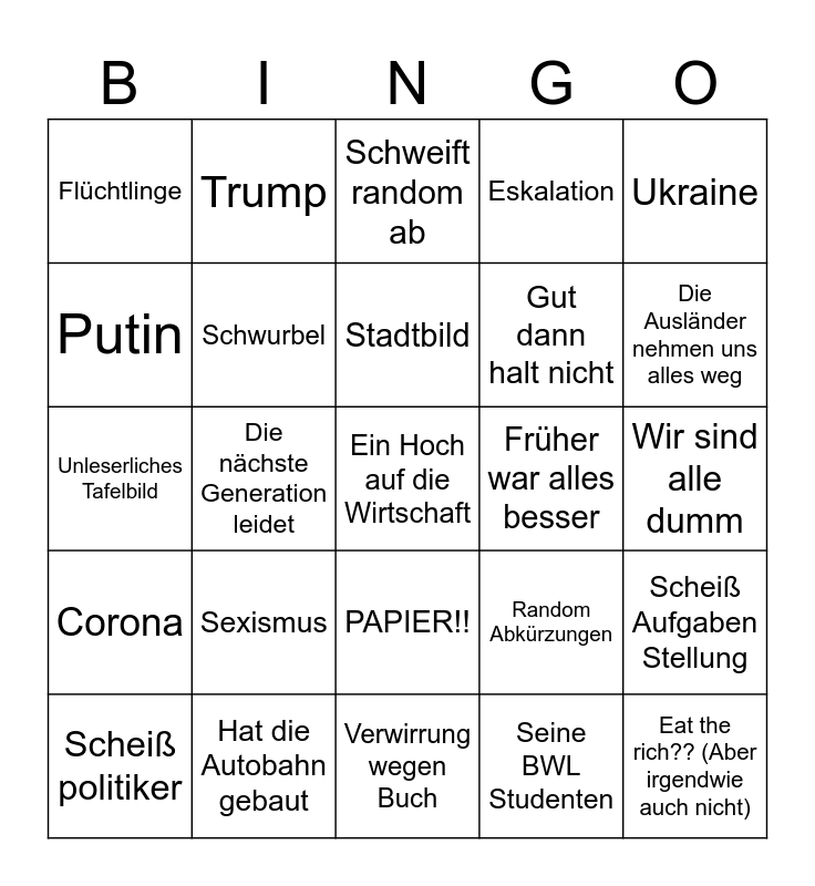 This bingo card has a free space and 24 words: Sexismus, Hat die Autobahn gebaut, Stadtbild, Scheiß politiker, Ukraine, Flüchtlinge, Putin, Trump, Früher war alles besser, PAPIER!!, Gut dann halt nicht, Unleserliches Tafelbild, Random Abkürzungen, Scheiß Aufgaben Stellung, Schwurbel, Seine BWL Studenten, Wir sind alle dumm, Schweift random ab, Die Ausländer nehmen uns alles weg, Die nächste Generation leidet, Eat the rich?? (Aber irgendwie auch nicht), Corona, Eskalation and Verwirrung wegen Buch.
