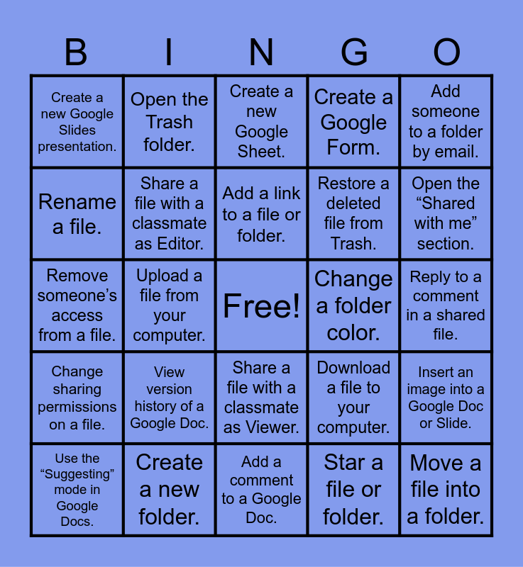 This bingo card has a free space and 30 words: Create a new folder., Rename a folder., Upload a file from your computer., Create a new Google Doc., Create a new Google Slides presentation., Create a new Google Sheet., Share a file with a classmate as Editor., Share a file with a classmate as Viewer., Change a folder color., Add a comment to a Google Doc., Reply to a comment in a shared file., Move a file into a folder., Star a file or folder., Use the search bar to find a file., Open the “Shared with me” section., Create a copy of a Google Doc., Download a file to your computer., Change sharing permissions on a file., View version history of a Google Doc., Add someone to a folder by email., Remove someone’s access from a file., Use “Make available offline” for a file., Open the Trash folder., Restore a deleted file from Trash., Rename a file., Create a Google Form., Insert an image into a Google Doc or Slide., Use the “Suggesting” mode in Google Docs., Add a link to a file or folder. and Organize files by dragging them into a new folder..
