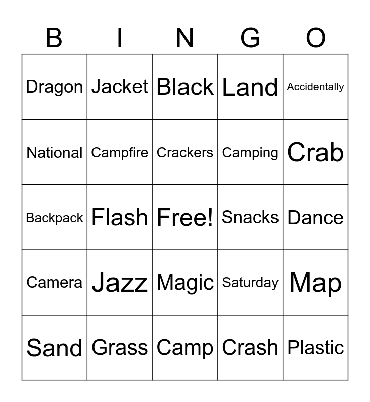 This bingo card has a free space and 27 words: Saturday, Dad, Camping, Camp, National, Black, Jacket, Camera, Snacks, Map, Backpack, Land, Sand, Grass, Crab, Sandwich, Campfire, Crackers, Jazz, Dragon, Dance, Crash, Flash, Plastic, Magic, Accidentally and Travel.