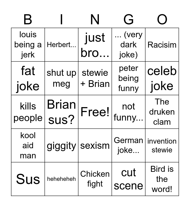 This bingo card has a free space and 24 words: giggity, heheheheh, stewie + Brian, Sus, Racisim, louis being a jerk, fat joke, Herbert..., not funny..., sexism, peter being funny, kills people, German joke..., invention stewie, shut up meg, cut scene, The druken clam, just bro..., celeb joke, Brian sus?, Bird is the word!, kool aid man, ... (very dark joke) and Chicken fight.