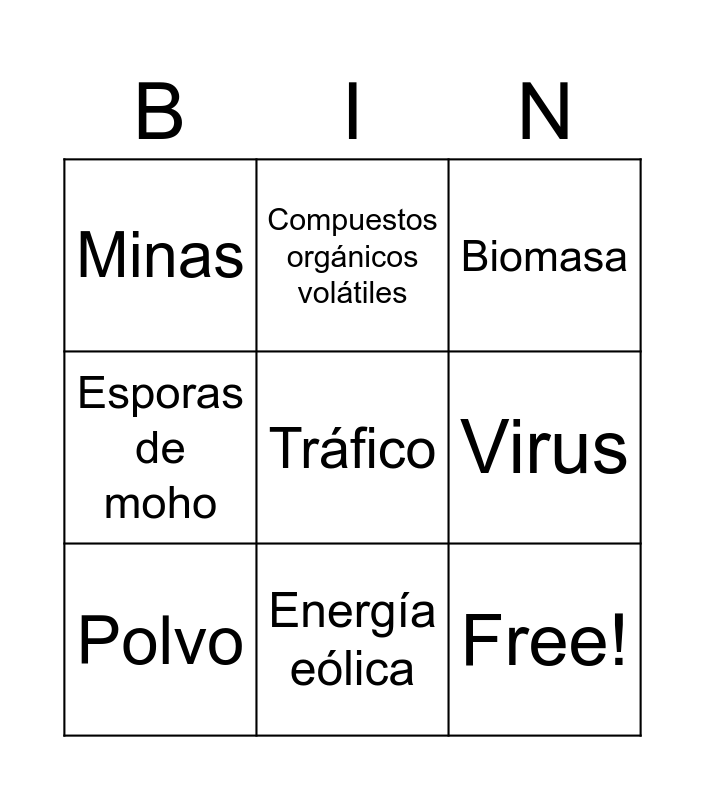 This bingo card has a free space and 60 words: Dióxido de carbono, Monóxido de carbono, Óxidos de nitrógeno, Dióxido de azufre, Compuestos orgánicos volátiles, Partículas PM2.5, Polvo, Metales pesados, Radiación, Polen, Esporas de moho, Bacterias, Virus, Quema de combustibles, Fábricas, Minas, Incendios forestales, Free!, Energía solar, Energía eólica, Energía hidráulica, Biomasa, Energía geotérmica, Efecto invernadero, Lluvia ácida, Calentamiento global, Deshielo de los polos, Cambio climático, Contaminación atmosférica, Reciclaje, Dióxido de carbono, Monóxido de carbono, Óxidos de nitrógeno, Dióxido de azufre, Compuestos orgánicos volátiles, Humo, Polvo, Metales pesados, Radiación, Polen, Esporas de moho, Bacterias, Virus, Quema de combustibles, Fábricas, Tráfico, Minas, Incendios forestales, Energía solar, Energía eólica, Energía hidráulica, Biomasa, Energía geotérmica, Efecto invernadero, Lluvia ácida, Calentamiento global, Deshielo de los polos, Cambio climático, Contaminación atmosférica and Reciclaje.