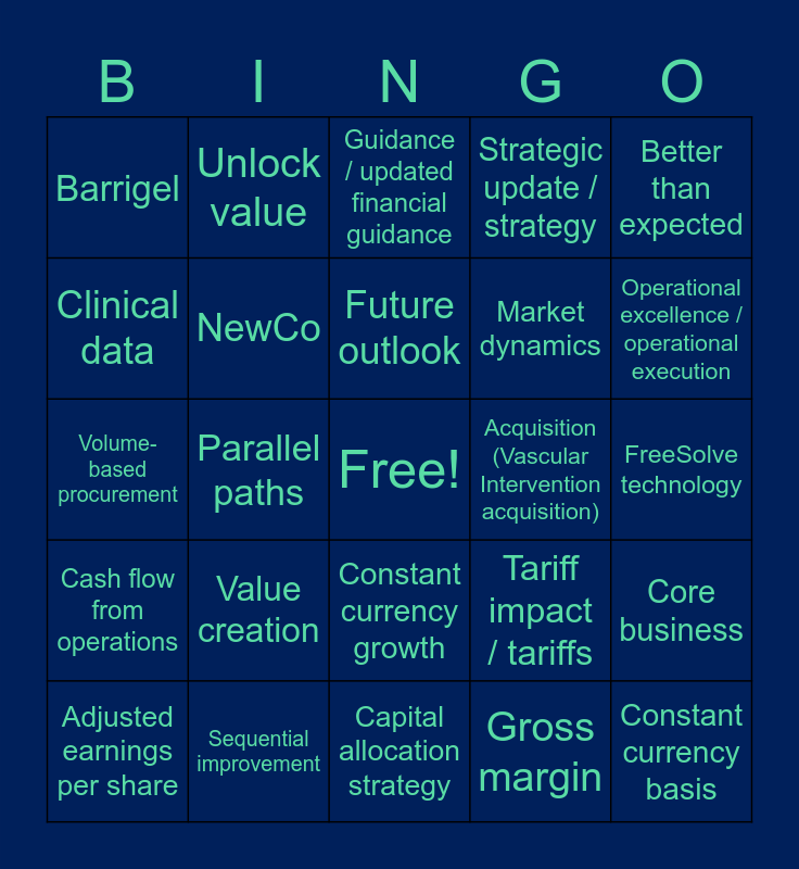 This bingo card has a free space and 45 words: Year-over-year growth, Constant currency basis, Revenue / revenue growth / revenues, Adjusted earnings per share, Operating margin, Gross margin, Guidance / updated financial guidance, In line with expectations, Better than expected, Sequential improvement, Strategic update / strategy, Acquisition (Vascular Intervention acquisition), Constant currency growth, Value creation, Interventional business, Capital allocation strategy, Shareholder value / maximizing shareholder value, Volume-based procurement, Integration activities / integration, Operational excellence / operational execution, Unlock value, Strategic rationale, UroLift, Barrigel, Titan SGS stapler, FreeSolve technology, Patient outcomes / patient care, Foreign exchange impact, Tariff impact / tariffs, Cash flow from operations, Cost inflation, Core business, Simplified manufacturing footprint, Focused strategic direction, Long-term growth, Parallel paths, Expressions of interest, Potential sale of Newco, Investor event, Future outlook, Clinical data, Market dynamics, Guiding principles, NewCo and Spin.