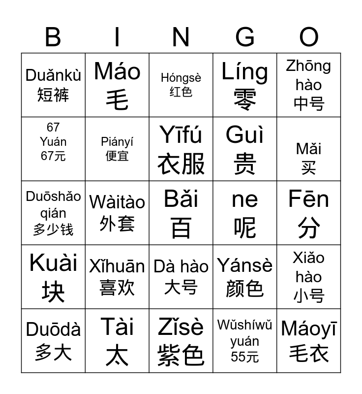 This bingo card has a free space and 24 words: Xǐhuān 喜欢, Tài 太, Yīfú 衣服, Duōdà 多大, Zhōng hào 中号, Duǎnkù 短裤, 67 Yuán 67元, Máo 毛, ne 呢, Dà hào 大号, Guì 贵, Duōshǎo qián 多少钱, Yánsè 颜色, Xiǎo hào 小号, Piányí 便宜, Wǔshíwǔ yuán 55元, Fēn 分, Hóngsè 红色, Mǎi 买, Wàitào 外套, Máoyī 毛衣, Kuài 块, Líng 零 and Zǐsè 紫色.