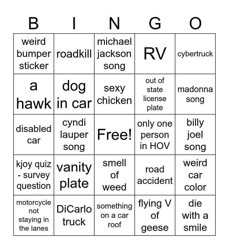 This bingo card has a free space and 24 words: vanity plate, DiCarlo truck, sexy chicken, motorcycle not staying in the lanes, cybertruck, weird bumper sticker, a hawk, roadkill, only one person in HOV, smell of weed, out of state license plate, disabled car, road accident, weird car color, dog in car, flying V of geese, billy joel song, michael jackson song, madonna song, cyndi lauper song, die with a smile, kjoy quiz - survey question, RV and something on a car roof.