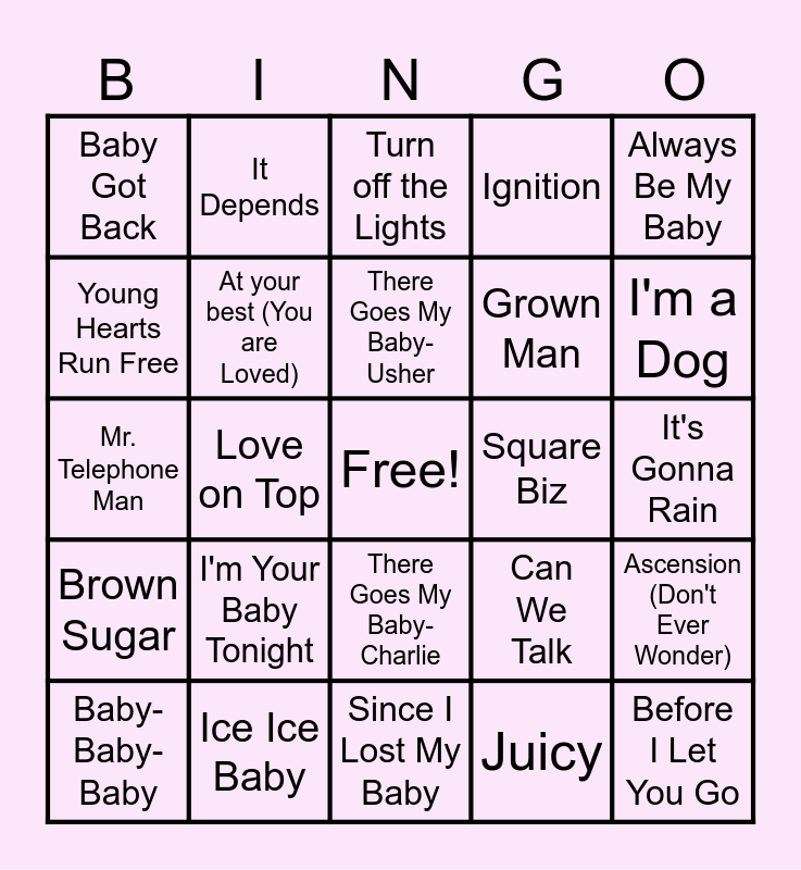 This bingo card has a free space and 24 words: I'm Your Baby Tonight, Ice Ice Baby, There Goes My Baby-Usher, Baby-Baby-Baby, Always Be My Baby, Baby Got Back, Young Hearts Run Free, It Depends, Square Biz, There Goes My Baby-Charlie, Grown Man, Mr. Telephone Man, Can We Talk, Ascension (Don't Ever Wonder), At your best (You are Loved), Juicy, It's Gonna Rain, Turn off the Lights, I'm a Dog, Love on Top, Before I Let You Go, Brown Sugar, Ignition and Since I Lost My Baby.