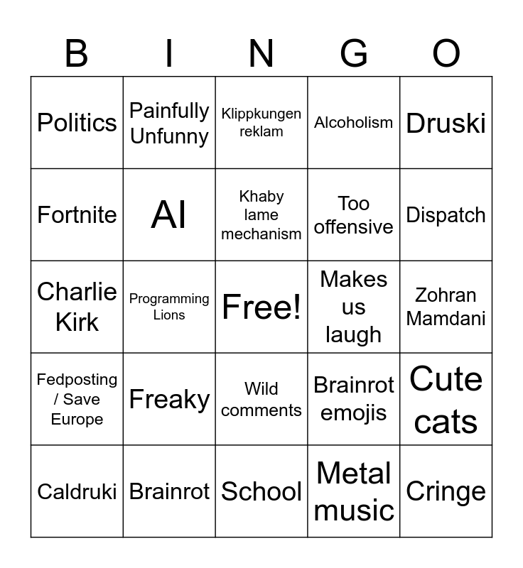 This bingo card has a free space and 24 words: Freaky, Brainrot, Khaby lame mechanism, Caldruki, Druski, Politics, Fortnite, Painfully Unfunny, Makes us laugh, Wild comments, Too offensive, Charlie Kirk, Brainrot emojis, Cute cats, AI, Metal music, Zohran Mamdani, Klippkungen reklam, Dispatch, Programming Lions, Cringe, Fedposting / Save Europe, Alcoholism and School.