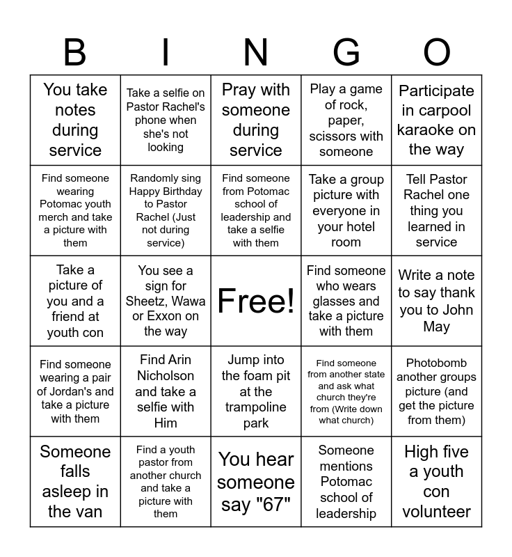 This bingo card has a free space and 25 words: Find Arin Nicholson and take a selfie with Him, You hear someone say "67", Find someone from Potomac school of leadership and take a selfie with them, Someone falls asleep in the van, Participate in carpool karaoke on the way, You take notes during service, Find someone wearing Potomac youth merch and take a picture with them, Take a selfie on Pastor Rachel's phone when she's not looking, Find someone who wears glasses and take a picture with them, Jump into the foam pit at the trampoline park, Take a group picture with everyone in your hotel room, Take a picture of you and a friend at youth con, Find someone from another state and ask what church they're from (Write down what church), Photobomb another groups picture (and get the picture from them), Randomly sing Happy Birthday to Pastor Rachel (Just not during service), Make Pastor Rachel laugh, Write a note to say thank you to John May, Pray with someone during service, Tell Pastor Rachel one thing you learned in service, You see a sign for Sheetz, Wawa or Exxon on the way, High five a youth con volunteer, Find a youth pastor from another church and take a picture with them, Find someone wearing a pair of Jordan's and take a picture with them, Play a game of rock, paper, scissors with someone and Someone mentions Potomac school of leadership.