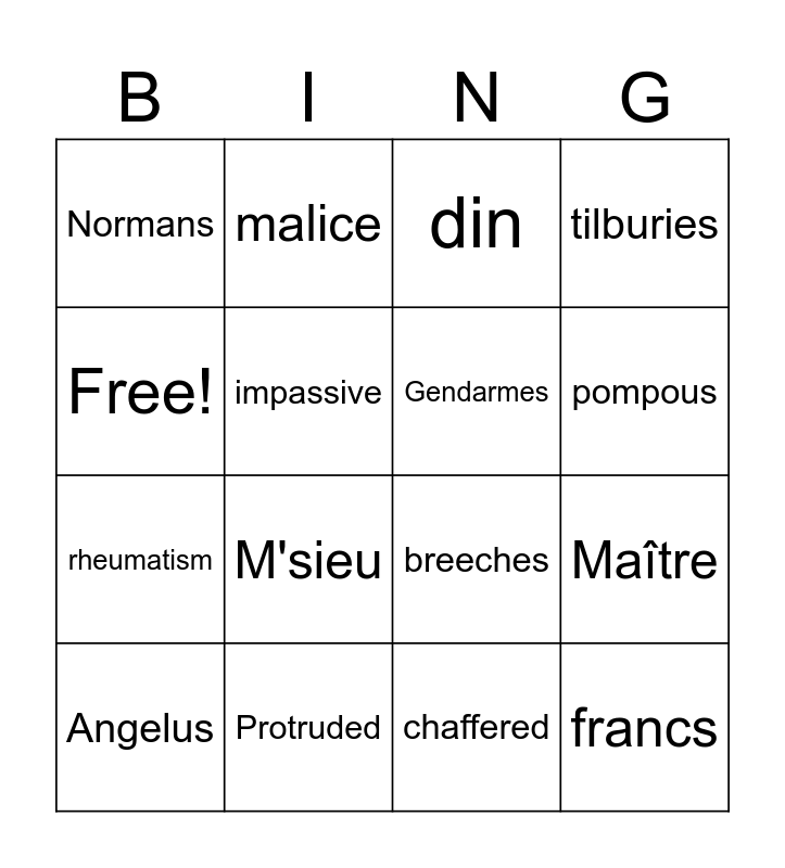 This bingo card has 16 words: Protruded, Maître, din, Normans, rheumatism, malice, breeches, chaffered, Free!, impassive, Angelus, tilburies, M'sieu, pompous, Gendarmes and francs.