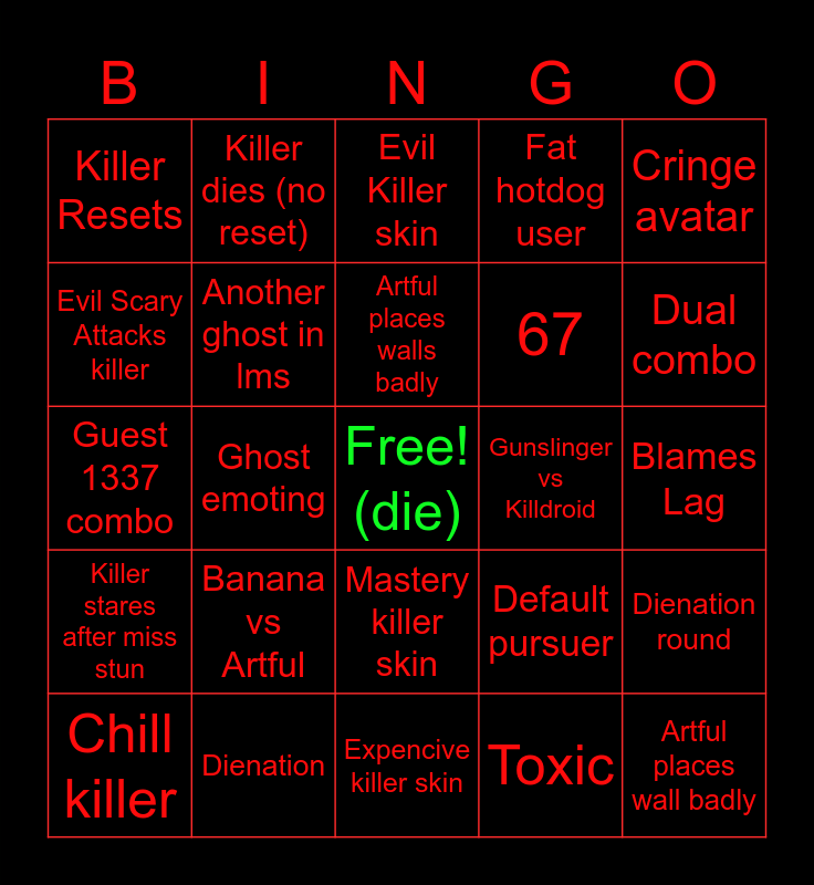 This bingo card has a free space and 24 words: Banana vs Artful, Dienation, Artful places walls badly, Chill killer, Cringe avatar, Killer Resets, Evil Scary Attacks killer, Killer dies (no reset), Gunslinger vs Killdroid, Mastery killer skin, 67, Guest 1337 combo, Default pursuer, Dienation round, Another ghost in lms, Toxic, Blames Lag, Evil Killer skin, Dual combo, Ghost emoting, Artful places wall badly, Killer stares after miss stun, Fat hotdog user and Expencive killer skin.