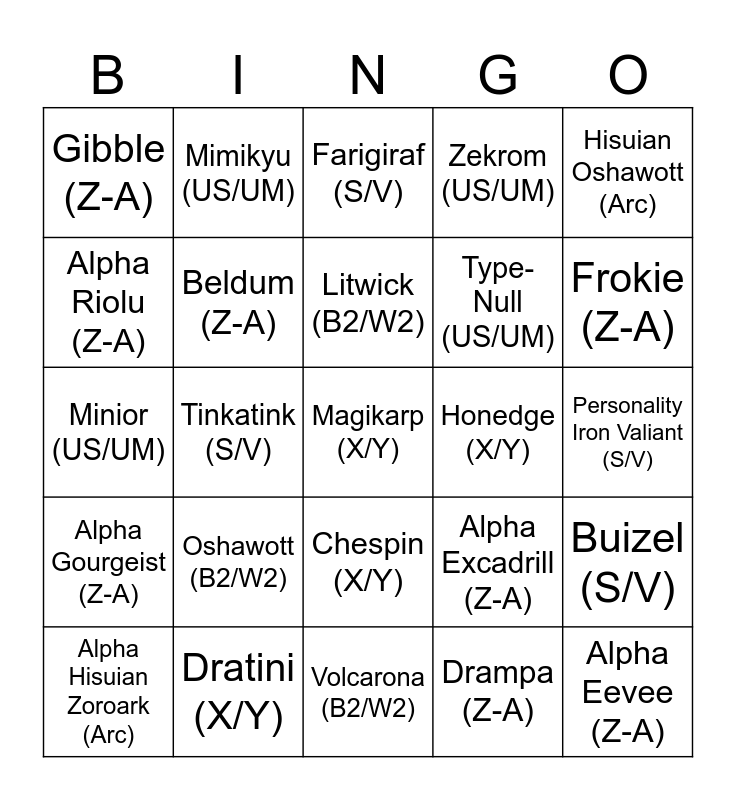 This bingo card has 25 words: Oshawott (B2/W2), Volcarona (B2/W2), Litwick (B2/W2), Alpha Hisuian Zoroark (Arc), Hisuian Oshawott (Arc), Gibble (Z-A), Alpha Riolu (Z-A), Mimikyu (US/UM), Honedge (X/Y), Chespin (X/Y), Type-Null (US/UM), Minior (US/UM), Alpha Excadrill (Z-A), Buizel (S/V), Beldum (Z-A), Alpha Eevee (Z-A), Personality Iron Valiant (S/V), Farigiraf (S/V), Frokie (Z-A), Tinkatink (S/V), Magikarp (X/Y), Dratini (X/Y), Alpha Gourgeist (Z-A), Zekrom (US/UM) and Drampa (Z-A).