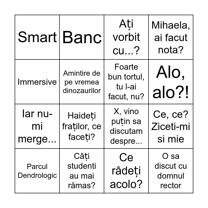 This bingo card has 16 words: Câți studenti au mai rămas?, Ce, ce?Ziceti-mi si mie, Ați vorbit cu...?, Smart, Iar nu-mi merge..., Banc, X, vino puțin sa discutam despre..., Ce râdeți acolo?, Immersive, Amintire de pe vremea dinozaurilor, Parcul Dendrologic, Mihaela, ai facut nota?, Haideți fraților, ce faceți?, Alo, alo?!, Foarte bun tortul, tu l-ai facut, nu? and O sa discut cu domnul rector.