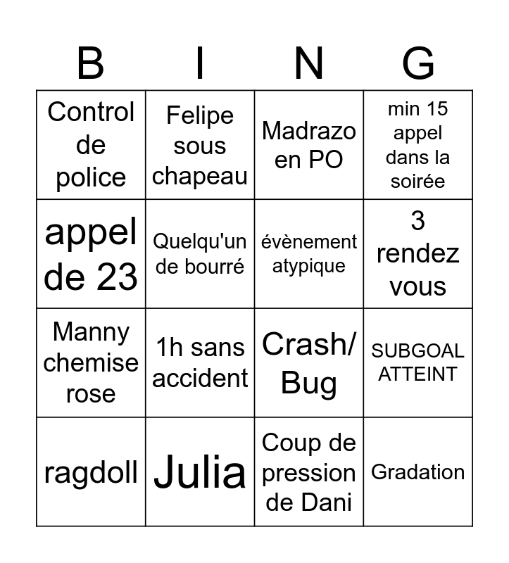 This bingo card has 16 words: Julia, SUBGOAL ATTEINT, Madrazo en PO, Control de police, Manny chemise rose, Felipe sous chapeau, Crash/ Bug, Coup de pression de Dani, appel de 23, Quelqu'un de bourré, ragdoll, min 15 appel dans la soirée, 1h sans accident, 3 rendez vous, évènement atypique and Gradation.