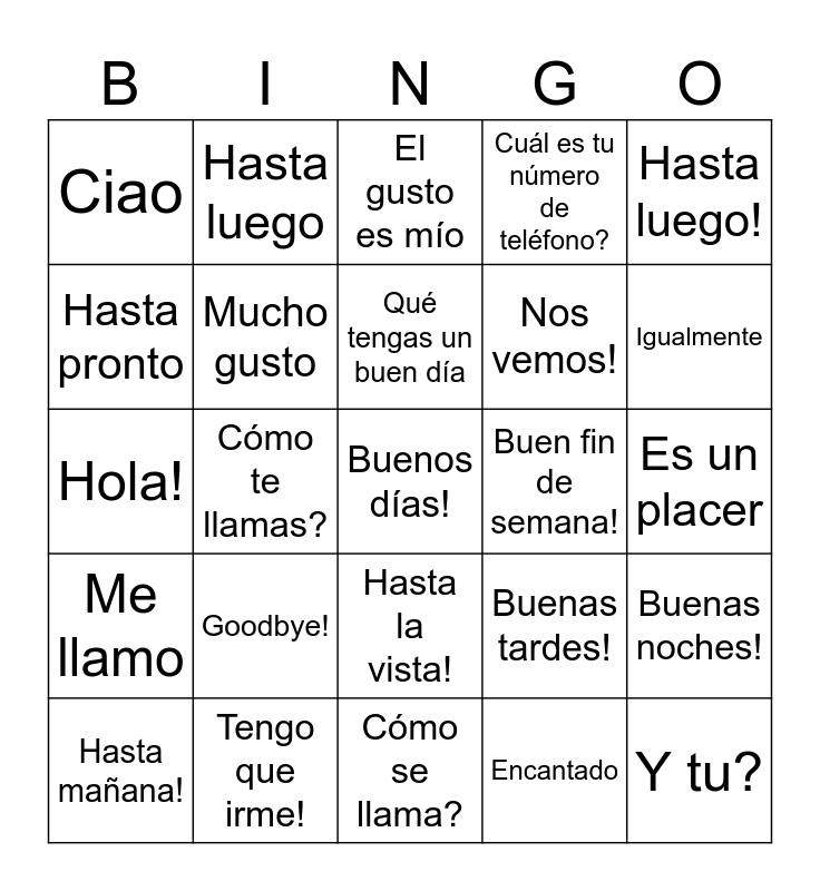 This bingo card has a free space and 24 words: Goodbye!, Tengo que irme!, Qué tengas un buen día, Hasta mañana!, Hasta luego!, Ciao, Hasta pronto, Hasta luego, Buen fin de semana!, Hasta la vista!, Nos vemos!, Hola!, Buenas tardes!, Buenas noches!, Mucho gusto, Encantado, Es un placer, El gusto es mío, Igualmente, Cómo te llamas?, Y tu?, Me llamo, Cuál es tu número de teléfono? and Cómo se llama?.